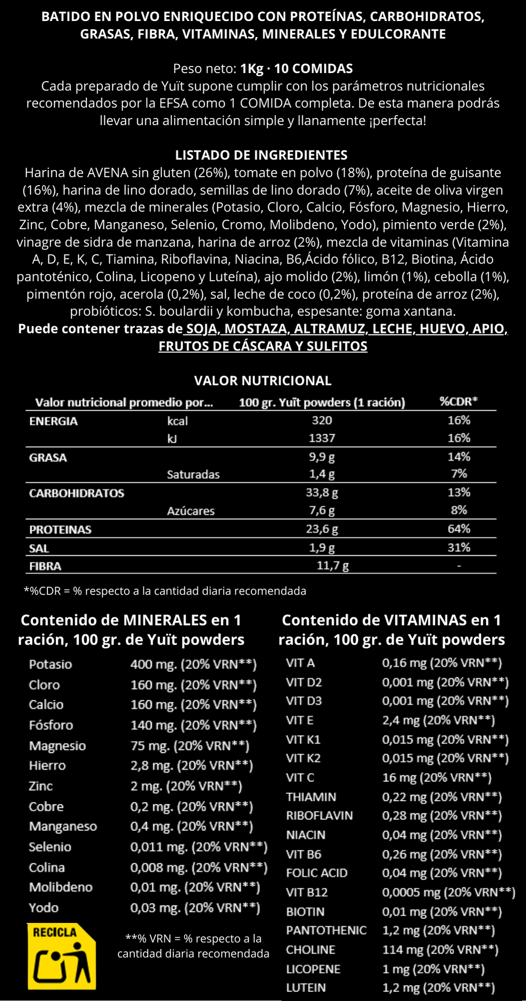 Nuestro perfil nutricional es que la EFSA establece como una comida completa, sana y equilibrada. Además incorporamos mix de vitaminas y minerales, y en el caso de los Yuït powders probióticos. Puedes consultar el detalle aquí.