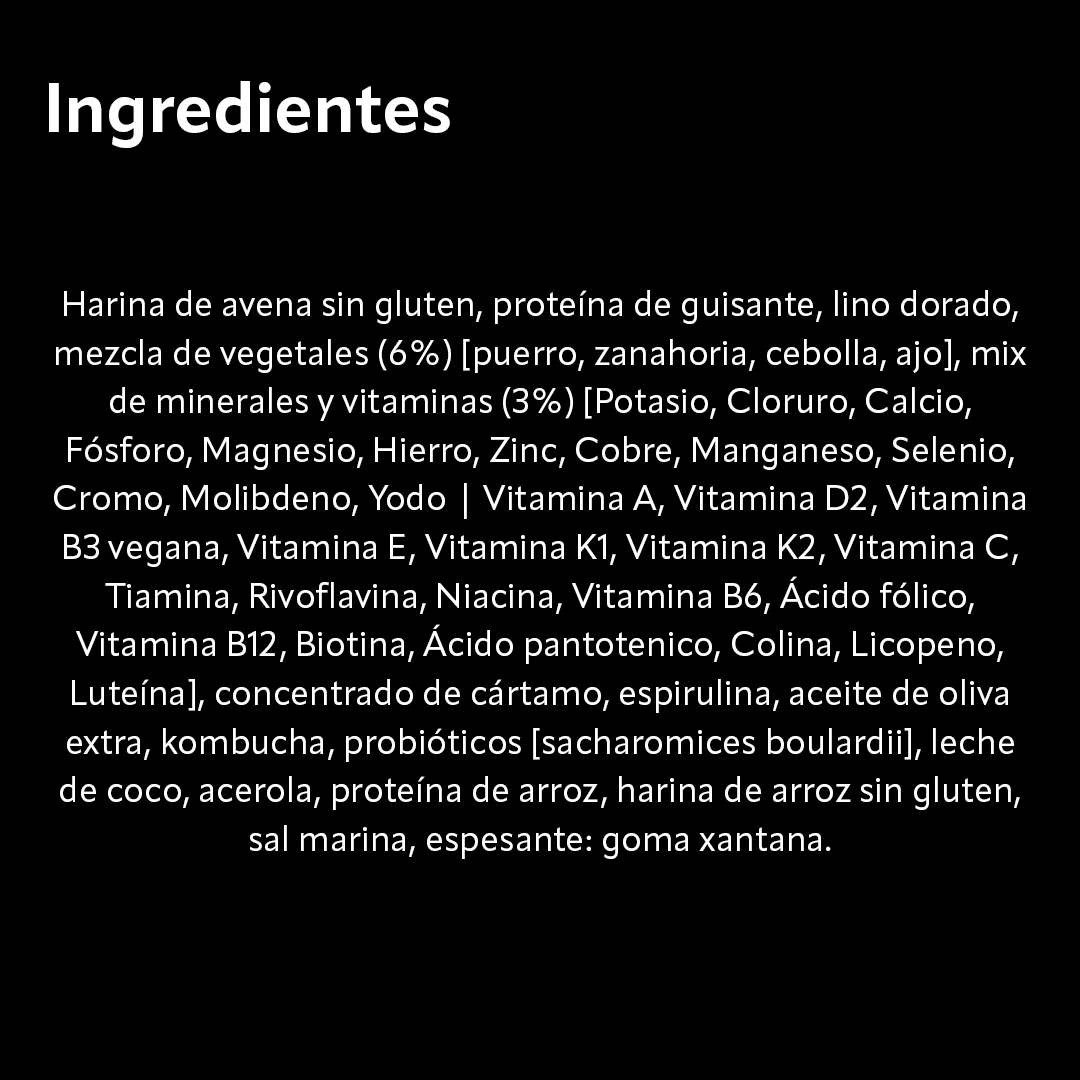 🍌 BANANUTS 🍌: Copos de avena sin gluten, fibra dietética vegetal, Jugo concentrado de plátano (15,9%), Aislado de proteína de SOJA, NUECES (8,8%), Aceite de oliva virgen extra (aove), Cobertura de chocolate negro con edulcorante cacao: 60% mínimo [pasta de cacao, edulcorantes: eritritol y glucósidos de esteviol, manteca de cacao, inulina, cacao desgrasado en polvo, emulgente: lecitinas (girasol), aroma natural de vainilla] (8%), Preparado de sales minerales*, Pasta de dátil, plátano deshidratado en polvo [plátano, maltodextrina] (0,4%), preparado de vitaminas**, Sal marina, Aromas, Molibdato sódico, Picolinato de cromo.