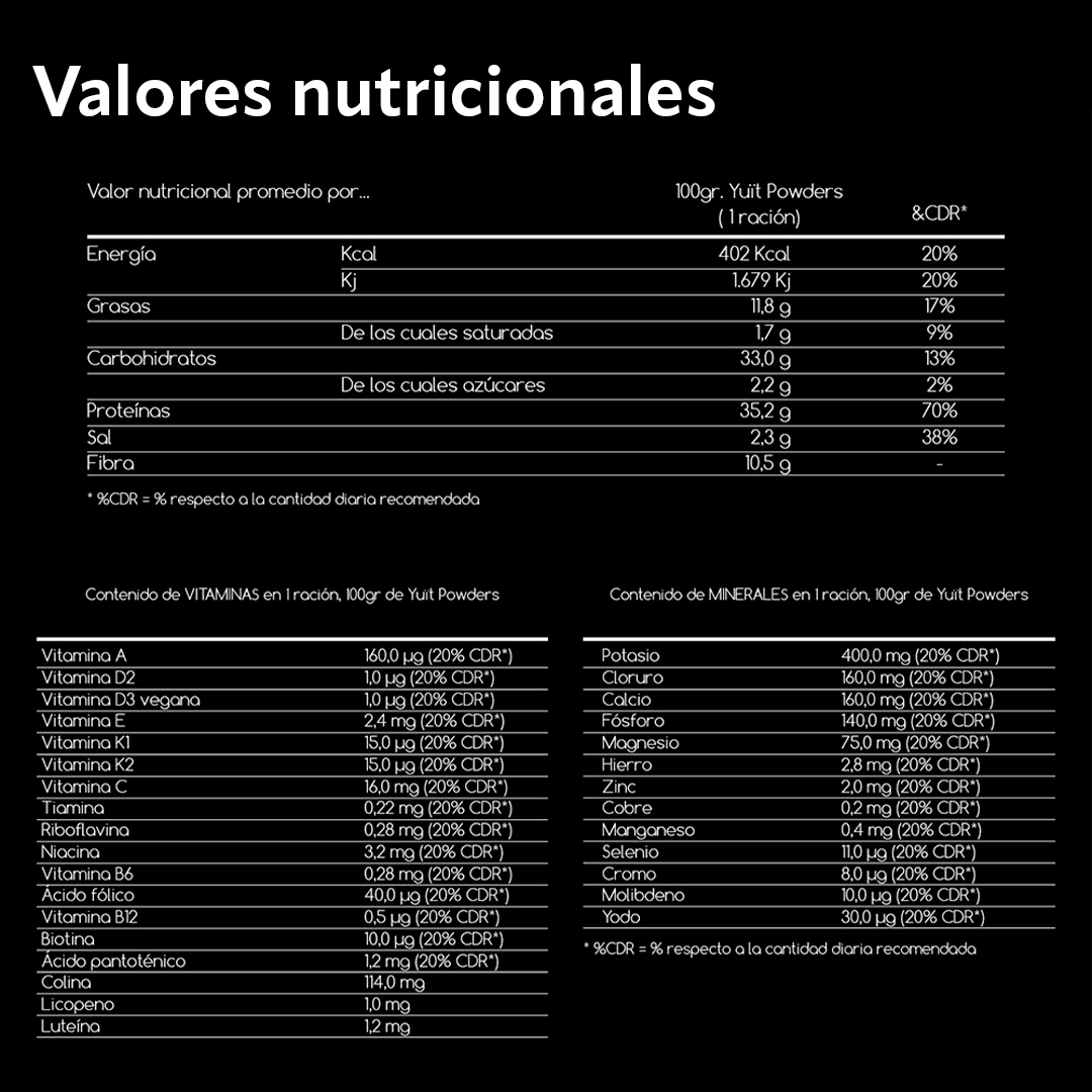 Nuestro perfil nutricional es que la EFSA establece como una comida completa, sana y equilibrada. Además incorporamos mix de vitaminas y minerales, y en el caso de los Yuït powders probióticos. Puedes consultar el detalle aquí.