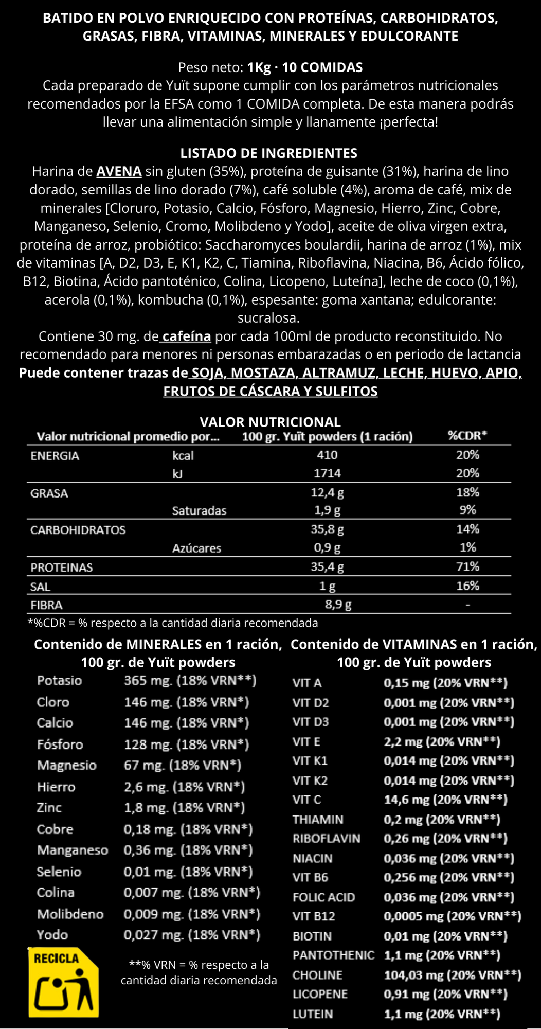 Cada preparado de Yuït supone cumplir con el 100% de los parámetros nutricionales recomendados por la EFSA (European Food Safety Authority) para 1 COMIDA, de esta manera podrás llevar una alimentación simple y llanamente ¡PERFECTA! Nuestro sobre es de 1Kg. y en él encontrarás la cantidad equivalente a 10 COMIDAS. De todas formas, no todos somos iguales, por lo que puedes sentirte libre en adaptar la ración a tus necesidades vitales.